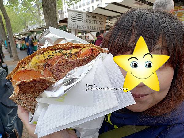接著是堪稱法國特產的可麗餅。可麗餅大致上分成兩種,甜的叫Crêpe、鹹的則稱為Galette。雖然巴黎街頭不乏可麗餅專賣店,但在市集裡的這個攤位也是物美價廉。有點像我們的蔥油餅,有時候簡單的煎鍋,配幾個常見的鹹、甜佐料就拿出來賣了,塞納河畔有不少這樣的餐車。此時只要掌握幾個基本的單字,就可以好好的點菜啦!有時候仔細看下方,根本就存在著英文翻譯。其實佐料的品項都是固定的,彼此間排列組合而已。以下圖而言,Raclette是一種起司,燒熱之後如同起司鍋般變成起司醬包裹佐料來吃;Saucisse就是臘腸;Fromage是起司;Tomate是番茄;œuf是蛋;Jambon是火腿、Chorizo是香腸;Poulet是雞肉;Andouille則是另一種香腸。