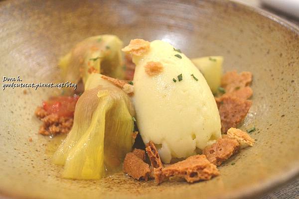 老婆肚量比較大,給她點四菜套餐而我是三菜套餐。四菜比三菜多一道前菜,就是這道綠蘆筍佐羊奶布里起司啦。布里起司 (Brie-cheese) 起源於歷史上法國北部的布里地區,質地柔軟;據說1815年滑鐵盧戰後的維也納條約簽署會議上,法國政治家 Talleyrand 為了紓緩、降低談判過程的緊繃與沉悶氣氛,乃提議舉辦一場乳酪大賽,最後由布里起司獲得所有代表一致通過,因而有「乳酪之王」的美譽。它屬於白黴乳酪,以生乳製作,風味濃郁飽滿,除了奶香、堅果香之外,同時帶有明顯的蘑菇、濕稻草以及土香。(資料來源)