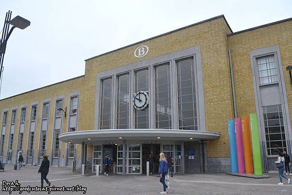 布魯日大約安排一天的時間參訪足矣,有些旅行團會安排到兩天。不過我這篇沒有要寫成布魯日觀光攻略之類的文章,篇幅有限,還是側重於食物的部分(?)。下圖為布魯日火車站,從布魯塞爾 (Bruxelles) 過來火車車程約一小時;從中途也很美麗的城市根特 (Ghent) 過來則約30-40分鐘。火車站造型相當簡樸,中央大大的「B」字樣即是比利時國鐵的標誌。