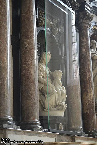 聖母教堂一共蓋了兩個世紀,一直到15世紀才落成,有著122公尺高的鐘樓,是布魯日次高的建築。米開朗基羅的鉅作【聖母與聖子像 Madonna and Child】雕像,曾經在兩次的戰爭中被強行佔據,最後經過交涉和努力才重新回到布魯日的手中。在教堂的其中一個角落,另有玻璃保護,只能遠遠地用放大鏡頭拍攝。