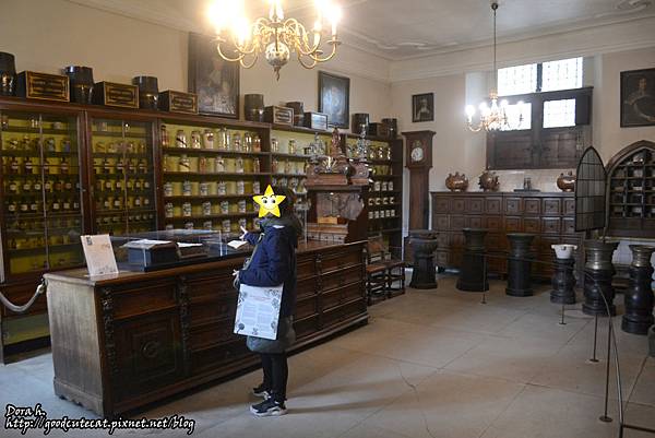 過去的藥房,頗有中藥房的味道,牆上的玻璃罐則像極了泡了蛇、毒蠍等物的藥酒xDD 老婆手上拿的是厚紙卡做的導覽介紹,有英、法、荷、西等語言,就是沒有亞洲文字。