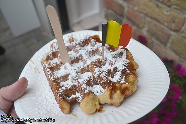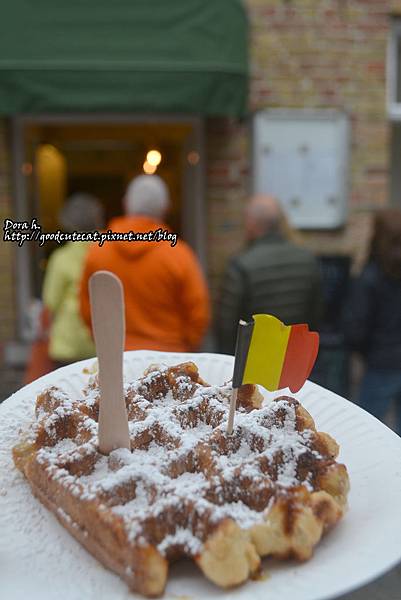 我們就簡單點了一個最素的糖粉鬆餅,插了一支可愛的比利時小國旗,要價 2.5歐。