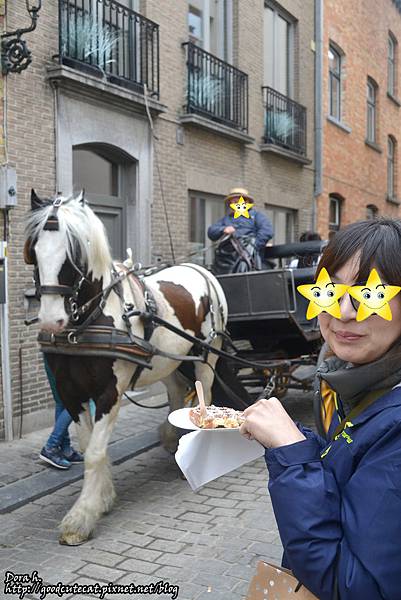 與路過的馬車合影。後來我才知道,原來這種鬆軟微韌的口感是列日鬆餅;與酥脆而空心的布魯塞爾鬆餅有別。