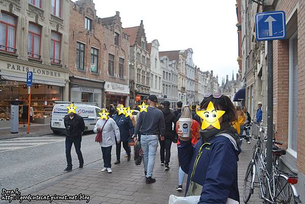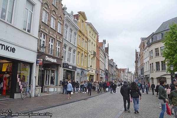 布魯日市區。打開 Google map 可以知道,布魯日主要的景點分為三個小區,一處是聖若望醫院加上O.L.V.聖母教堂、第二處是鐘樓所在布魯日市集廣場,第三處則是市政廳廣場 / 城堡廣場。我們正從第一區的醫院+教堂走向第二區,路上除了基本款鬆餅+巧克力,還有一些國際的服飾品牌。