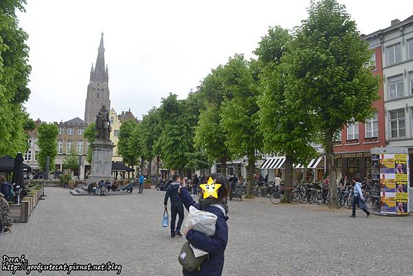 Simon Stevin雕像小廣場,可以眺望遠處O.L.V.聖母教堂的尖塔。畫面右下角是 The Chocolate Line,號稱是連當地人也喜歡的巧克力店。