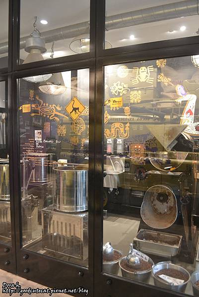 店內把運送可可,將可可壓製成粉作出巧克力的過程以藝術的方式呈現。