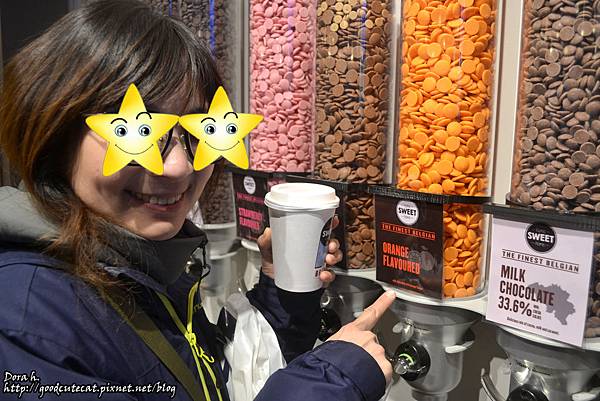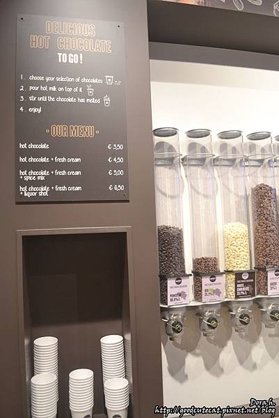 我們選了特別的橘子口味,自行從罐子裡取出數十片巧克力豆後,再請店家幫忙沖熱牛奶,一杯要價 3.5歐。但建議還是一般的黑巧就好...橘子的味道跟巧克力超不搭xD