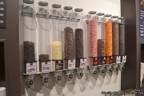牆上有一整排各色各種口味的巧克力豆,從基本的黑巧、牛奶口味的、草莓口味的一應俱全。
