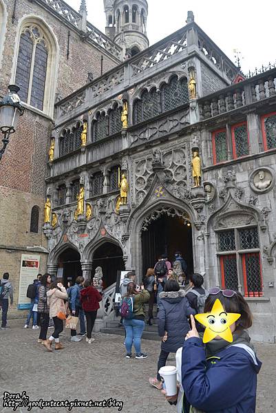 位在市政廳右手邊,算是市政廳廣場 / 城堡廣場 (Burg Square) 的一個小角落,建築本色是鐵灰色,上頭裝飾有金色雕像,是廣場上最有歷史的建築,建成於1157年,至今已有800多年歷史。所供奉的聖血,指的是基督的血,是蒂耶德里克在十字軍東征時,從聖地(伊斯坦堡)所帶回來供奉的寶物。共分兩層,上層供奉聖血;下層為小禮拜堂,供奉聖巴西略。但大部分人都是為了瞻仰聖血而來的,時間為每日的14:00-15:00,聖血的部分無票價,採自由捐獻。我們幸運地參加到了瞻仰聖血的隊伍,聖血由神職人員保護,放在一個玻璃箱裡,再用金子與玻璃混合的容器盛裝,但內部不開放拍照,故留給讀者現場來體驗啦!