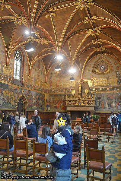 走上樓,最值得一拍的就是這個金碧輝煌的禮堂啦!牆壁四週均是政治活動相關的壁畫。禮堂再往裡走一點,有布魯日歷史的介紹與地景變遷的模型。前述布魯日因河道淤積開始沒落的過程,在這裡也可略知一二。