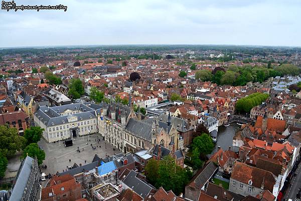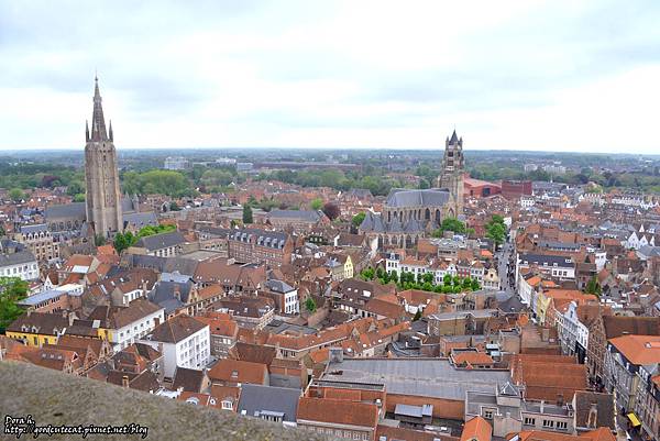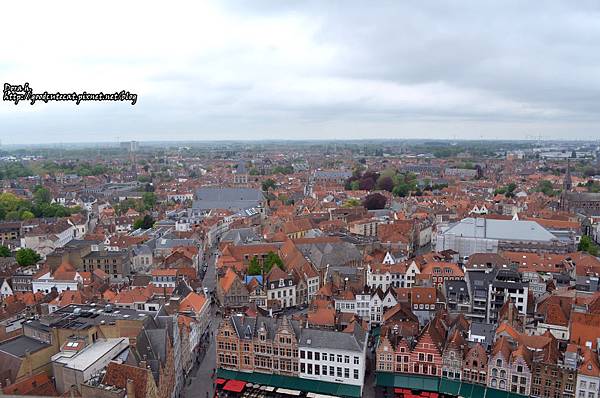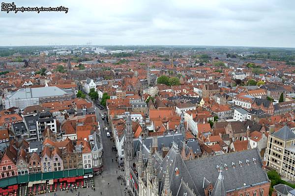 往西方拍攝,底下有照到一些布魯日市集廣場的建築物,再遠一些是可愛的紅頂建築,城市的盡頭則是綠色的平原。