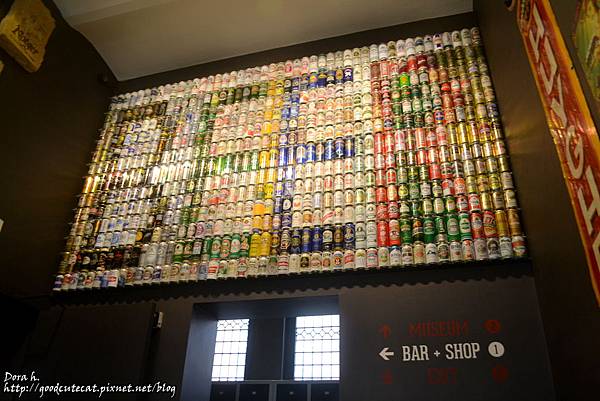 正走著樓梯,抬頭就是大大啤酒罐堆出的"BEER"字樣。