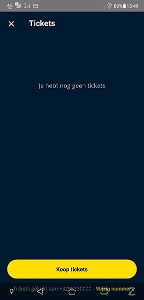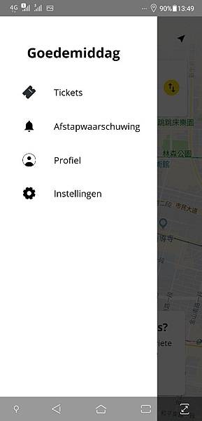 雖然都是荷蘭文,但透過裡面少數的英文做操作還是可以的。在上面按了黃色的 ok 按鈕以後,可先設定以 Facebook 或 Google 帳號登入,就不用額外再申請帳號密碼。然後將左列選單拉出,選擇 Tickets,購買車票。下圖是我在台北車站打開這個 app,因此地圖是顯示北車附近的。