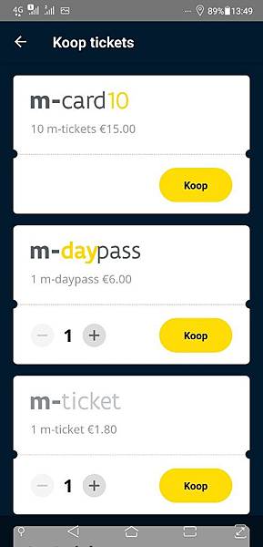 接著選票種,詳細的購票說明可以上官網,雖然是荷蘭文但可以透過Google chrome內建的英文翻譯功能來略知一二。第一張m-card10指的是購買10次60分鐘內無限乘坐的機會,要價15歐;第二張m-daypass則是單日無限乘坐,要價6歐;第三張m-ticket是單程票,要價1.8歐。若在公車/輕軌上購買單程票,要價3歐且不找零。下載這個app不但方便還可以省錢。選好要幾張票就可以按下黃色的Koop按鈕付款啦!我的手機有使用 Google pay,因此用事先綁定的信用卡付款即可。