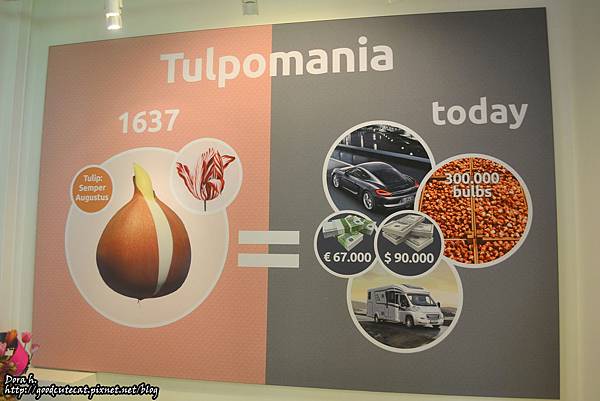 "Juliana / Tulpomania" 是一座小博物館,稍微解釋17世紀鬱金香泡沫的現象,與1980年代臺灣的蘭花泡沫有異曲同工之妙。1637年的荷蘭,發生了全球歷史上最早的泡沫經濟事件。當時荷蘭的北部七省因對抗西班牙勝利,又從葡萄牙手中奪取了香料貿易生意,加上中歐地區處在三十年戰爭的陰霾,阿姆斯特丹在彼時歐洲的商業發展上,可說是一枝獨秀。鬱金香的美麗起初是吸引了手頭寬裕的收集者,例如畫家林布朗 (Rembrandt Harmenszoon van Rijn) 的名畫中那位給學生上解剖課的外科醫師,就從本名 C.Pietersz 改成 Nicolaes Tulp;Tulp 就是荷蘭語中鬱金香的意思。
