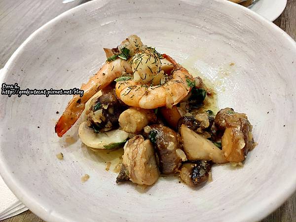 炒蘑菇算是法式料理裡的經典,儘管用料簡單,卻能把香料與油熱熱暖暖的香氣炒進多汁的蘑菇裡,連剩下的油也可以沾麵包吃。鮮蝦的味道在這裡有點獨立,但作為配色,提高食材的豐富,還是不錯的。
